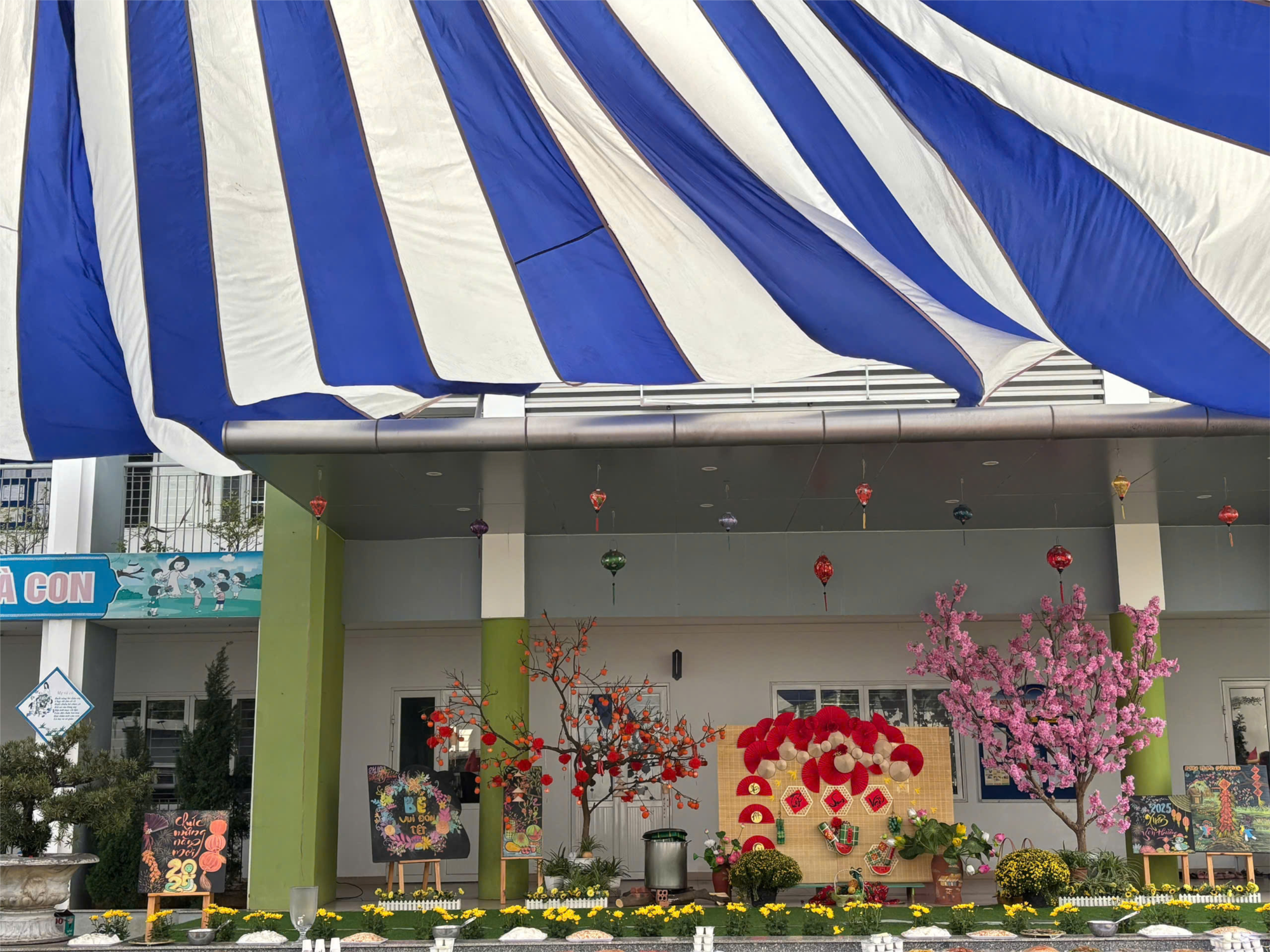 Vào những ngày giáp Tết, không khí ở trường học lại càng thêm rộn ràng. Cô giáo đã tổ chức cho các bé làm đẹp hơn không gian lớp học của mình như: Trang trí cây đào, cây mai, kết hoa, vẽ tranh, làm thiệp,...Bé còn được được giao lưu văn nghệ với các bài hát có nội dung chủ đề Tết và mùa xuân… được thưởng thức những món ăn ngon, bổ dưỡng trong bữa tiệc Buffet mừng xuân đón Tết. Hòa trong không khí tưng bừng phấn khởi chào đón Tết Nguyên Đán Ất Tỵ 2025, trường Mầm non Hoa Phượng tổ chức chương trình“ Bé vui đón Tết” thật rực rỡ, với những tiết mục văn nghệ đặc sắc và bữa tiệc Buffet vô cùng hấp dẫn làm cho không khí đón Tết của các bé càng trở lên tưng bừng, nhộn nhịp.